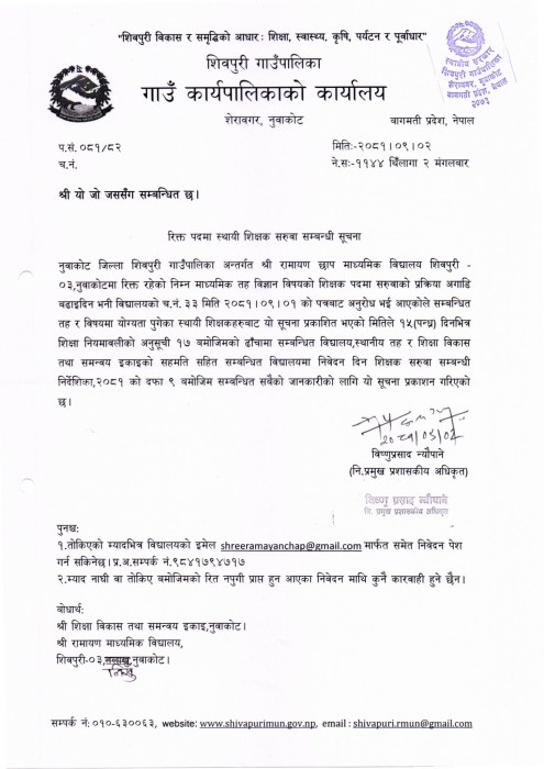 रामायण छाप माध्यमिक विद्यालय, शिवपुरी-३ मा रिक्त पदमा स्थायी शिक्षक सरुवा सम्बन्धी सूचना