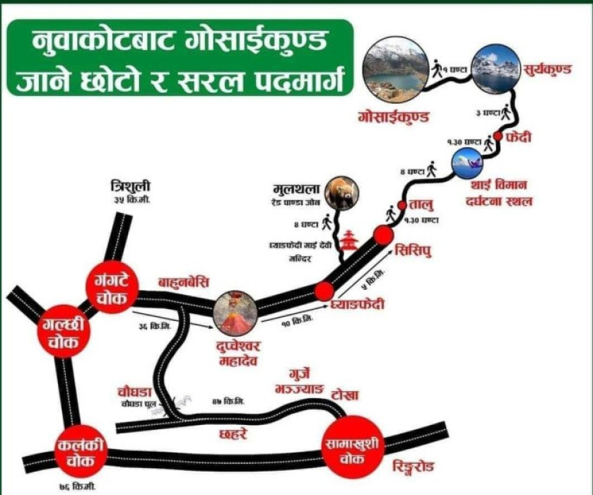 गोसाइँकुण्ड जाँदै हुनुहुन्छ ? छिटो र सहज यात्राको लागि प्रयोग गर्नुहोस् नुवाकोट दुप्चेश्वरको पदमार्ग